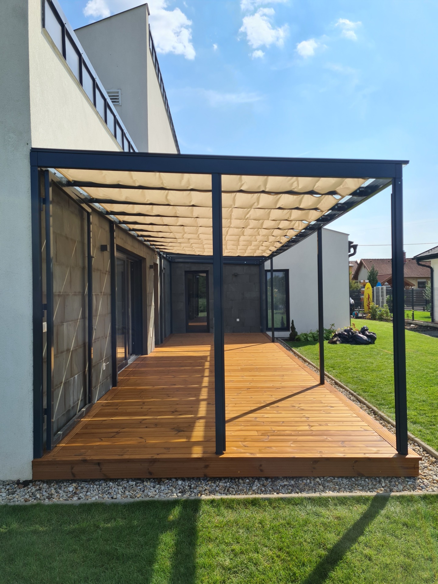 Vászonárnyékoló termékünk a tökéletes kiegészítője minden teraszfedésnek, pergolának vagy téli kertnek. Harmónikusan illeszkedik bármilyen környeztbe, és kellemes árnyékos oázist teremt még a legnagyobb nyári melegben is.